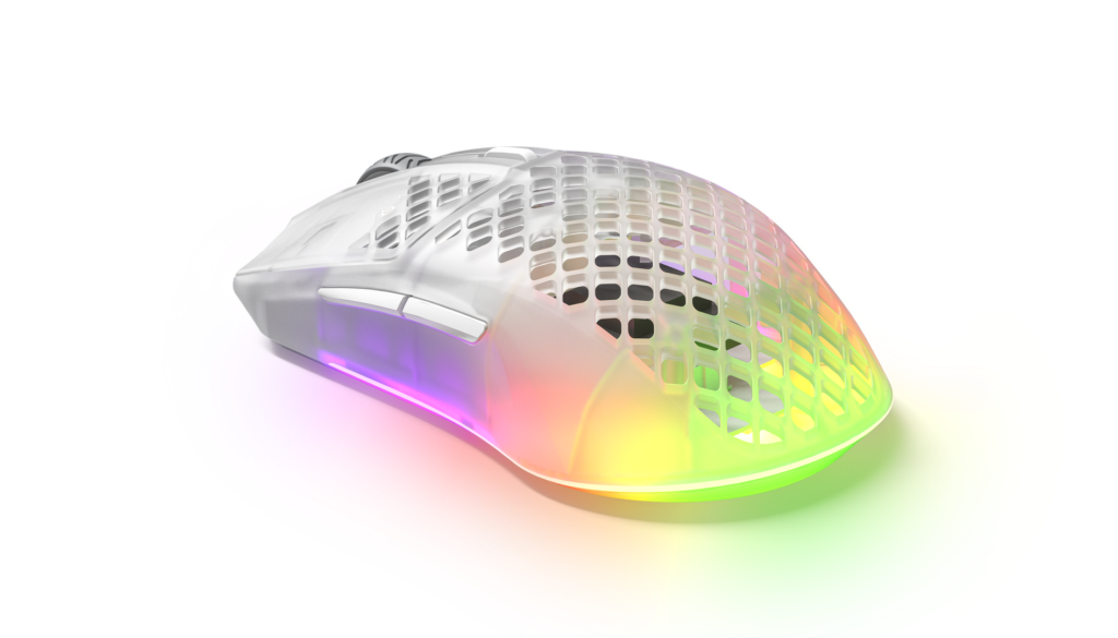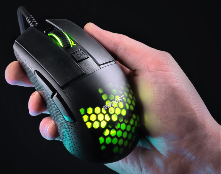 (強度をあまり損なわずに必要な材料を減らすことができる。)でマウスの重量を軽くするとともにホコリや汚れからもマウスを守ってくれます。通常のハニカム構造だとむき出しでほこりなどが故障の原因になりやすい。「Owl-Eye 光学式センサー」を搭載しており、DPIの設定を50区切りで調整も可能にしております。
